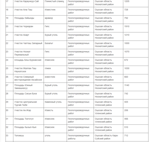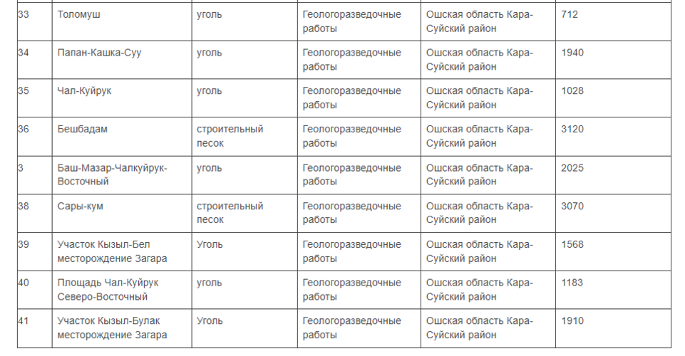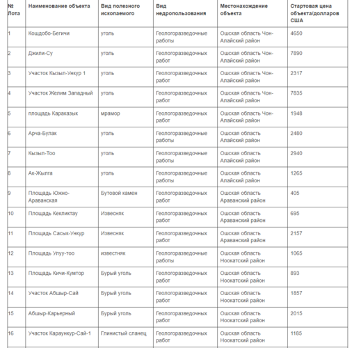 The Kyrgyz Geological Service of the Ministry of Natural Resources, Ecology and Technical Supervision has announced an auction for sites in Chon-Alai, Alai, Aravan, Nookat, Uzgen and Kara-Suu districts of Osh region. The press service of the ministry reported.
