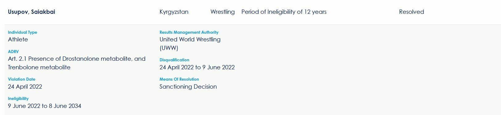 Earlier it was reported that another Greco-Roman wrestler from the Kyrgyz Republic, Akylbek Talantbekov, was disqualified until June 11, 2027.