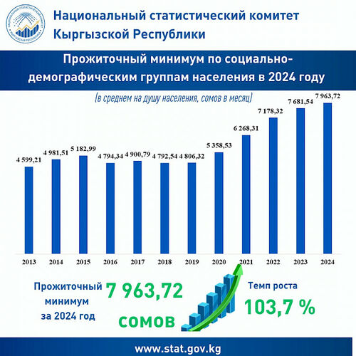 The average minimum subsistence level per capita in Kyrgyzstan in 2024 was 7,963.72 soms. Materials of the National Statistical Committee say.