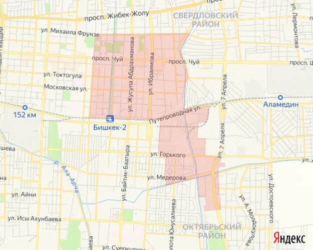 - Railway line — Frunze Street — Alamedin River — Panfilov Street;