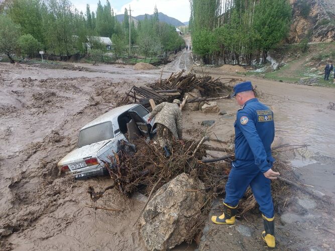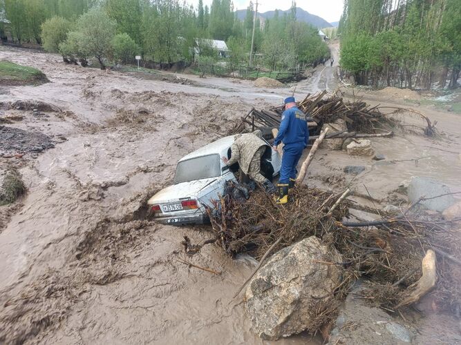 A mudflow came down from mountain ravines in Ala-Buka district, flooding the yard of a residential building, sweeping away two cars and destroying two bridges. The press service of the Ministry of Emergency Situations reports.