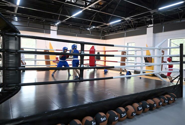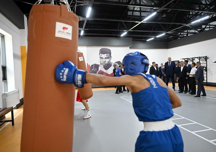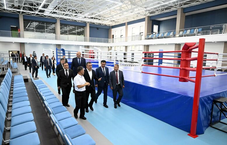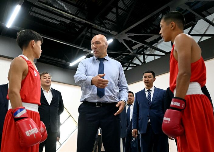 The President and his delegation visited the new building of the Boxing Academy. Among the guests were the head of the State Committee for National Security Kamchybek Tashiev and the world boxing star, former world heavyweight champion, and current deputy of the State Duma of Russia Nikolai Valuev.