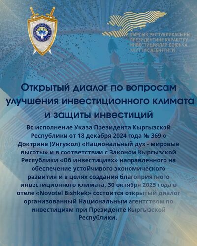 On October 30, the National Investment Agency will hold an open dialogue pursuant to Presidential Decree No. 369 of December 18, 2024, on the doctrine (unguzhol) National Spirit — Global Heights and in accordance with the Law «On Investments.» This document aims to ensure sustainable economic development and create a favorable investment climate.