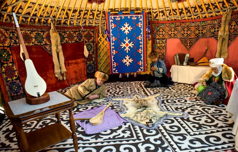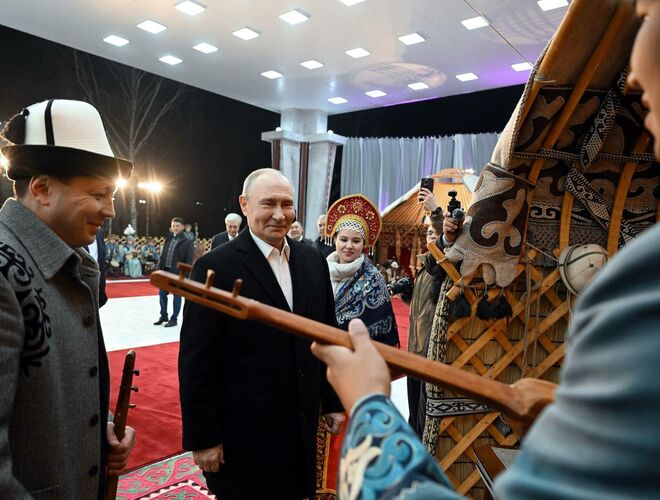 During the tour, Vladimir Putin took interest in the performance of a young komuz player. The Russian leader picked up the instrument and tried to repeat several chords shown to him by the young musician.