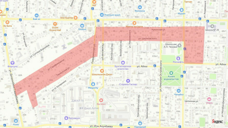- Sadyrbaev, Tashauzskaya, Tsiolkovsky, Chukotskaya, and Bakayev Streets.