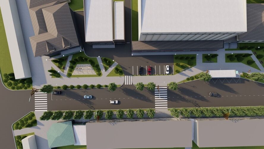 The plans include the construction of public transport stops, pedestrian and bicycle paths, as well as the installation of lighting poles. The project also provides for the placement of small architectural forms, landscaping of the area, and the organization of parking spaces.