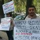 The people hold posters in English «Mr. Peter Burian, in Kyrgyz Republic 25 political prisoners!», «Save and security to Sadyr Japarov and his supporters!», «Asanov and Kadyrov free!» and a large poster in Russian «Freedom to political prisoners!»