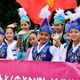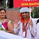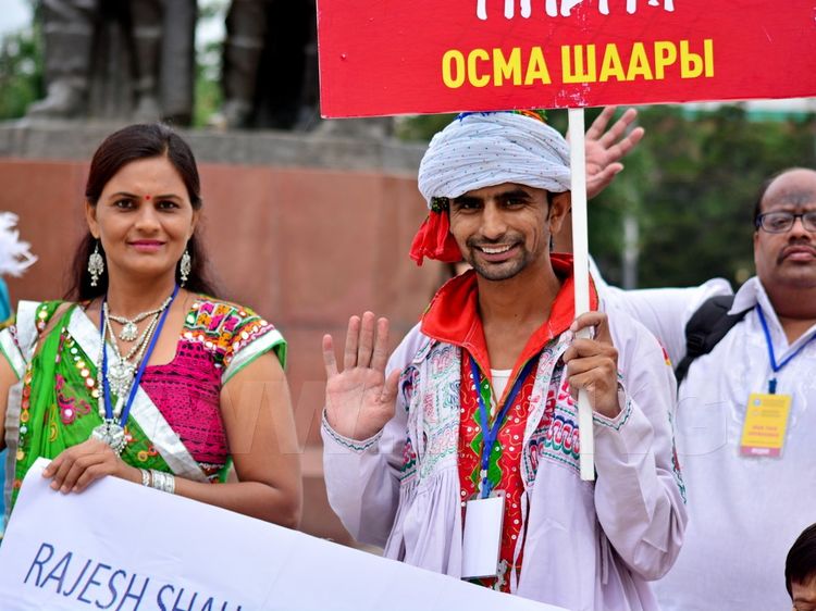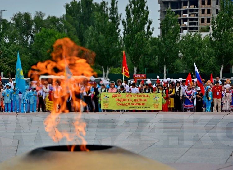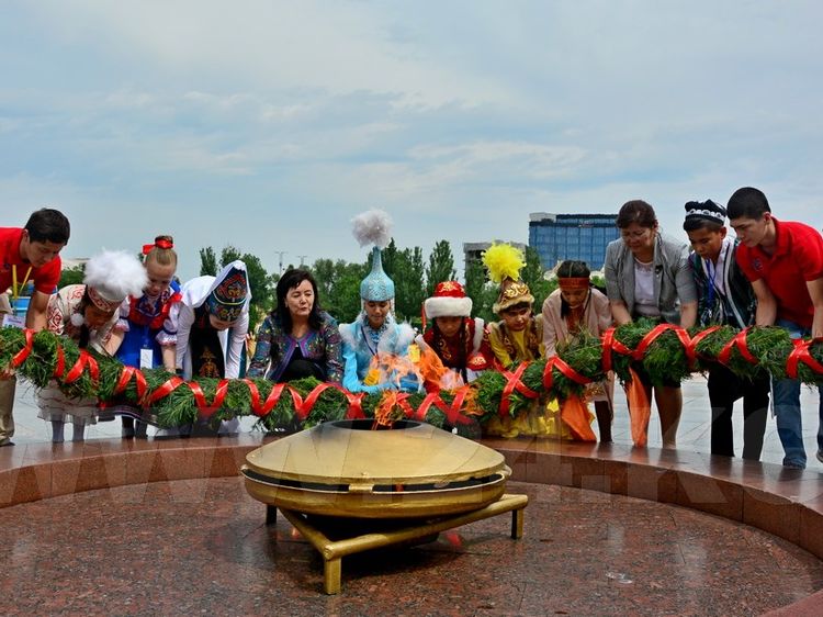 Delegates in national costumes gathered at the central square and with flags and billboards marched to Victory Square and laid flowers to the Eternal Flame.