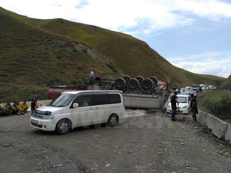 Gasoline tanker overturned on Bishkek-Osh road in Kok-Bei Pass area. As a result, many kilometers long traffic jam formed there.