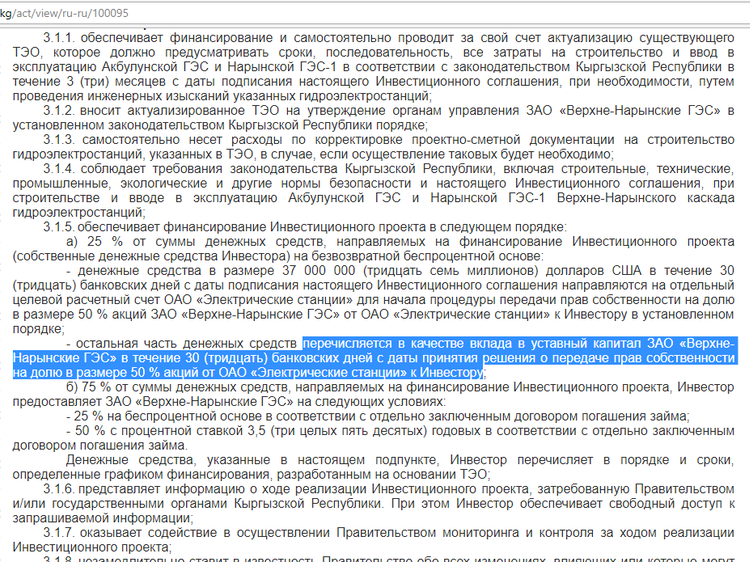 However, recently, the Ministry of Justice posted on its website a government decree on the contract with Liglass Trading. There is also an investment agreement in it. This document states that 25 percent of the total contract amount is a free-of-charge contribution of Liglass Trading to the construction project of the Upper Naryn cascade of HPPs. At the same time, the first $ 37 millions of this amount are to be transferred within 30 banking days after the signing of the agreement. And the Czech company is to transfer the rest of the sum after the approval of the transaction on transfer of 50 percent of the shares of Upper Naryn HPP CJSC to Liglass Trading.