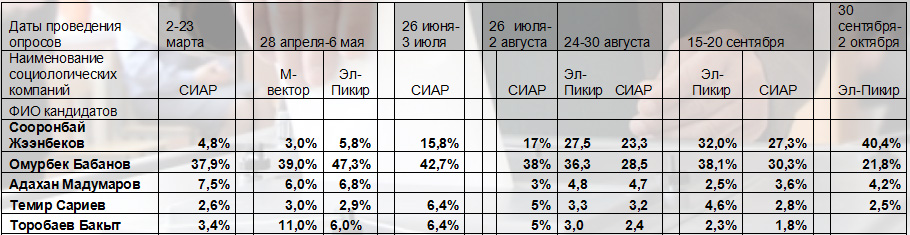 «Unfortunately, such an example is an attempt by one of the candidates to impose unconfirmed data on the alleged readiness of «65.5 percent of the population» to vote for him «in the first round». I think it is important to bring to the public real information, in particular, the results of sociological research conducted by the leading sociological services in Kyrgyzstan from March to October 2017,» the message says.