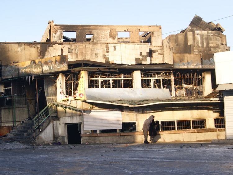 Nothing survived in the market building. Burnt stairs, doors, iron frames of shelves, it seems, will collapse from a light touch. All the goods that turned into a black-gray ashen mass lie on the floor.