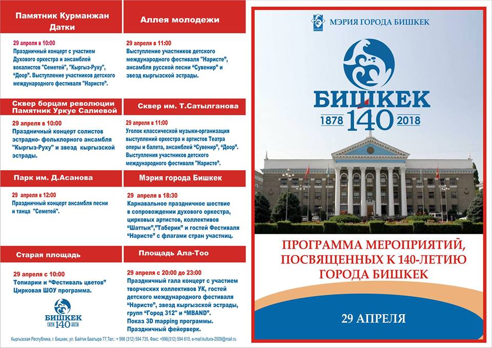 «One of these days, T.Moldo park will host a book exhibition «My Favorite City»; on April 23, Toktogul Museum will host a round table discussion «History and future of Bishkek city.» The International Children’s Folklore Festival «Nariste» will start at the Philharmonic Hall on April 27. Performance groups from Italy, Turkey, Hungary, Sierra Leone, Russia and Kazakhstan will participate in it. The festival will take place in different parts of the city and will last until May 1. A carnival procession from the Bishkek City Administration building to Ala-Too Square will take place on April 29,» the department told.