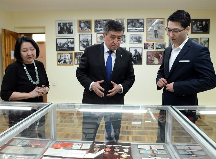 The wife of the writer Maria Aitmatova and son Eldar Aitmatov showed the head of state the museum of the people’s writer of Kyrgyzstan, his manuscripts. The relatives of the writer told about work on museum development, eternalizing the Aitmatov’s memory.