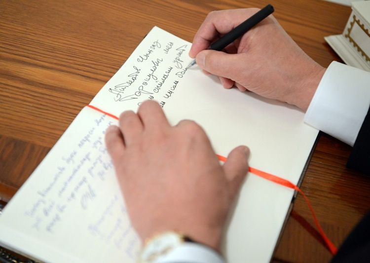 The President Sooronbai Jeenbekov left a note in the book of visitors of the house museum of Chingiz Aitmatov and was photographed with the relatives of the writer.