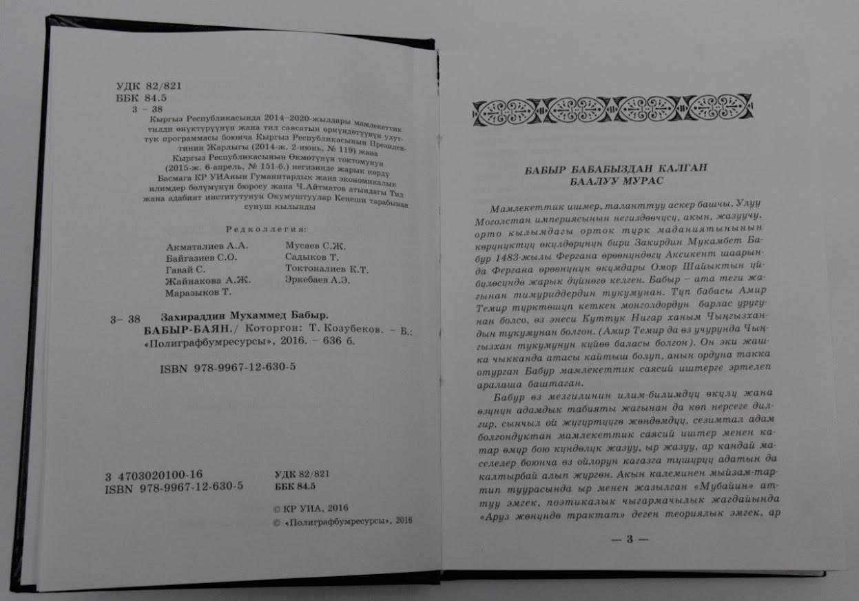 В столице Кыргызстана издали книгу «Бабыр-баян» («Записки Бабура») на кыргызском языке. Об этом сообщили в Национальной академии наук КР.