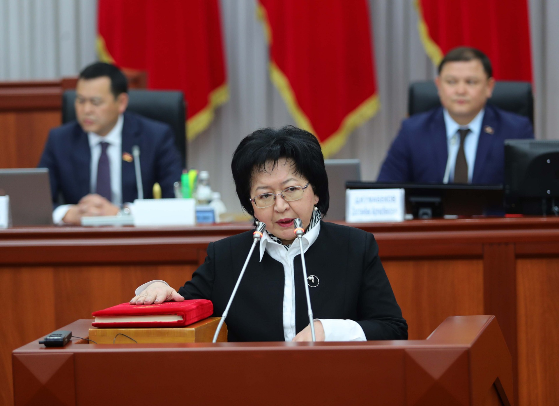 Жогорку Кеӊештин төрагасы Дастанбек Жумабеков жалпы депутаттардын атынан Бактыгүл Жээнбеков менен Жанат Бейшеновду ант берүү аземи менен куттуктап, алардын ишинде ийгиликтерди каалады.