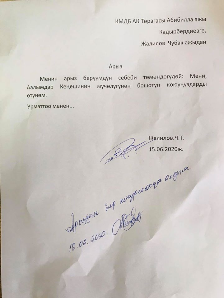 Ал өз эрки менен кызматты тапшырып жатканын белгилейт.