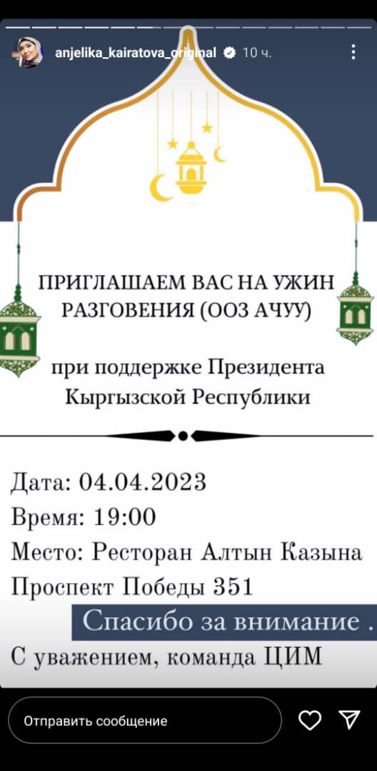 Ырчы Анжелика Кайратованын маалыматында, ооз ачарды «Эл үмүтү» партиясынын лидери Аскар Алмаз уулу Садыр Жапаровдун атынан уюштурган.