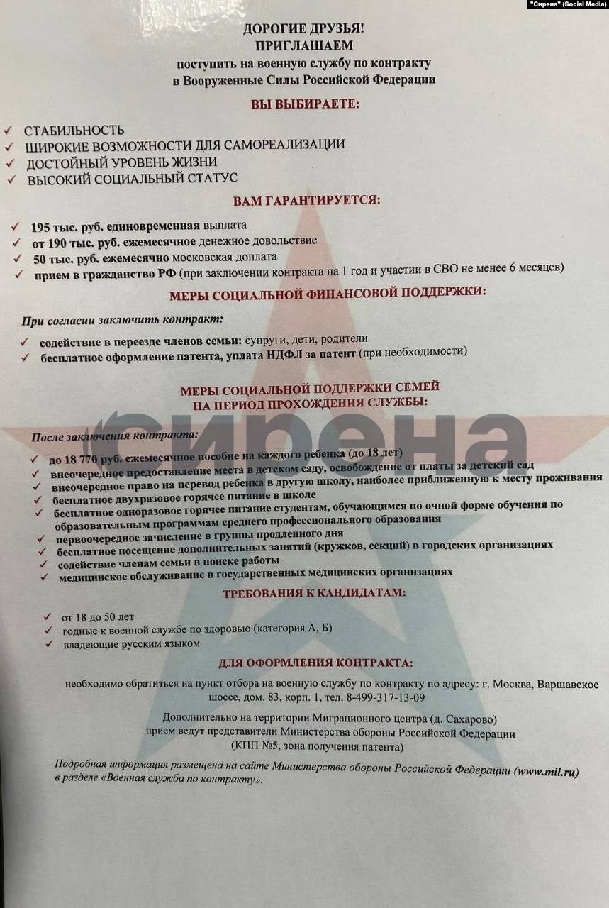 Орус аскеринде кызмат өтөөнү каалагандарга айына 190 миң рубль, балдарына жөлөк пул, бала бакчага жана мектепке орноштуруу, мектепте эки маал бекер тамактануу, мамлекеттик мекемелерде бекер дарылануу жана үй-бүлө мүчөлөрүн жумуш орун менен камсыздоо сунушталат.