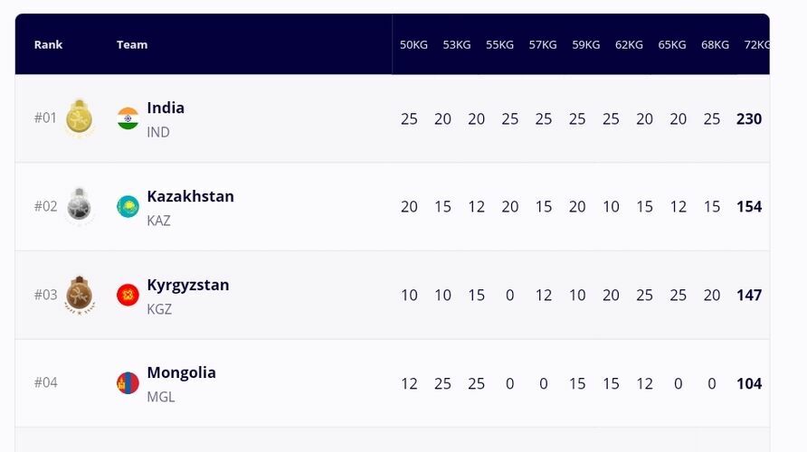 Командалык эсеп боюнча 230 упай менен 1-орунга Индия курама командасы чыкса, 2-орунду 154 упай менен коңшу Казакстан командасы ээледи. Ал эми ата мекендик спортчулар 147 упай менен 3-орунду багындыра алды.
