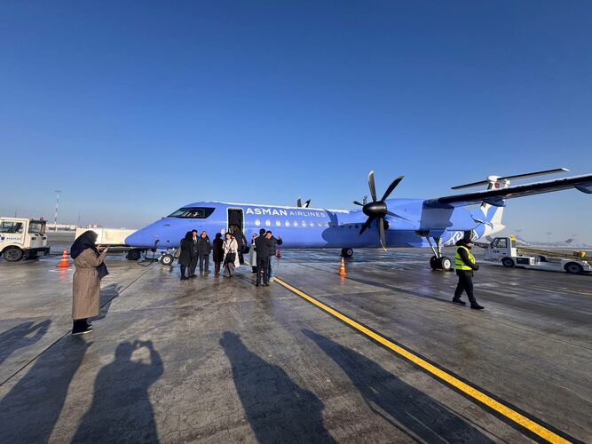 «Асман аба жолдору» мамлекеттик авиакомпаниясынын Dash 8 Q400 учагы Бишкектен учуп, жарым сааттан кийин салтанаттуу иш-чара өткөн Каракол эл аралык аэропортуна келип жетти.