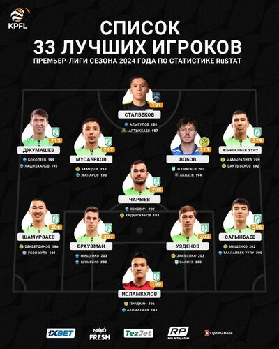 2024-жылкы сезон үчүн Кыргызстандын Премьер-Лигасынын 33 мыкты футболчусун атады. Кыргызстандын Профессионалдуу футбол лигасы билдиргендей, RuStat агенттиги Кыргызстандын Премьер-Лигасынын 2024-жылдын сезонундагы беттештерин анализдеп, анын негизинде сезондун жыйынтыгында эң жогорку көрсөткүчкө ээ болгон 33 оюнчу тандалып алынган.