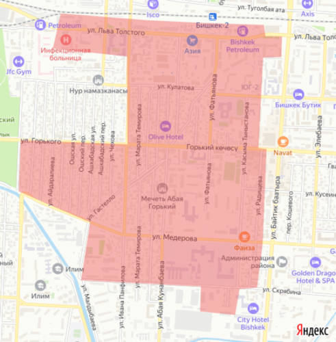 Скрябин — Тыныстанов — Радищев — Панфилов — Медеровго чейин Горький — Лев Толстой — Панфилов көчөлөрү.