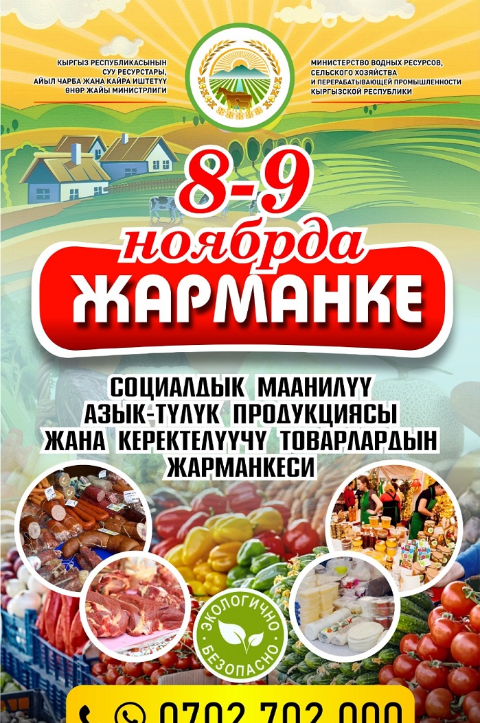 Бишкекте 8-9-ноябрда социалдык маанилүү азык-түлүктөрдү сунуштаган жергиликтүү өндүрүүчүлөрдүн, дыйкандардын жана кол өнөрчүлөрдүн жарманкеси өтөт. Бул тууралуу Суу ресурстары, айыл чарба жана кайра иштетүү өнөр жайы министрлигинен билдиришти.