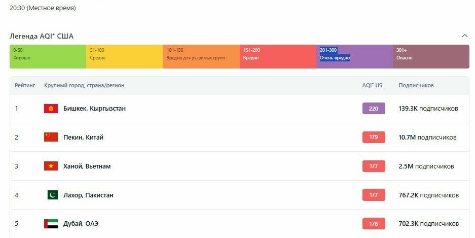 Кечээ кечинде Кыргызстандын борбору дагы бир жолу эң булганган абасы бар шаарлардын тизмесинде биринчи орунда турду. Бул дүйнө жүзү боюнча ар кайсы шаарлардагы абанын сапатын көзөмөлдөгөн IQAir порталынын маалыматтары боюнча белгиленди.