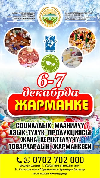 6-7-декабрда Бишкекте кезектеги айыл чарба жарманкеси өтөт. Бул тууралуу Суу ресурстары, айыл чарба жана кайра иштетүү өнөр жайы министрлигинен билдиришти.