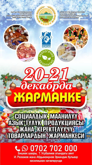 Бишкек шаарында, 20-21-декабрь күндөрү азык-түлүк жарманкеси өткөрүлөт. Бул тууралуу Суу ресурстары, айыл чарба жана кайра иштетүү өнөр жайы министрлиги кабарлады.