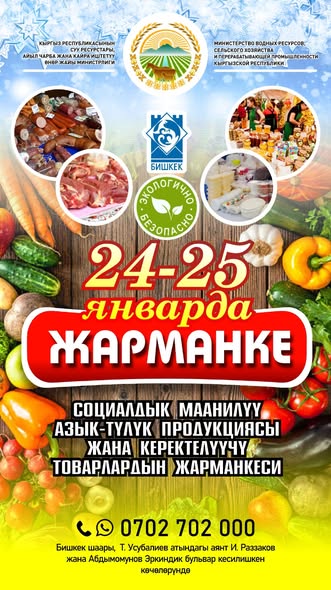 24-25-январда Бишкек шаарында социалдык маанилүү азык-түлүк товарларын сунуштаган жергиликтүү өндүрүүчүлөрдүн, дыйкандардын жарманкеси өткөрүлөт. Бул тууралуу Суу ресурстары, айыл чарба жана кайра иштетүү өнөр жайы министрлигинен билдиришти.