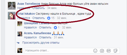 20 жаштагы студент кыз ооруканадан табылды. Бул тууралуу анын агасы Эртай Исаков Facebook баракчасына жазды.