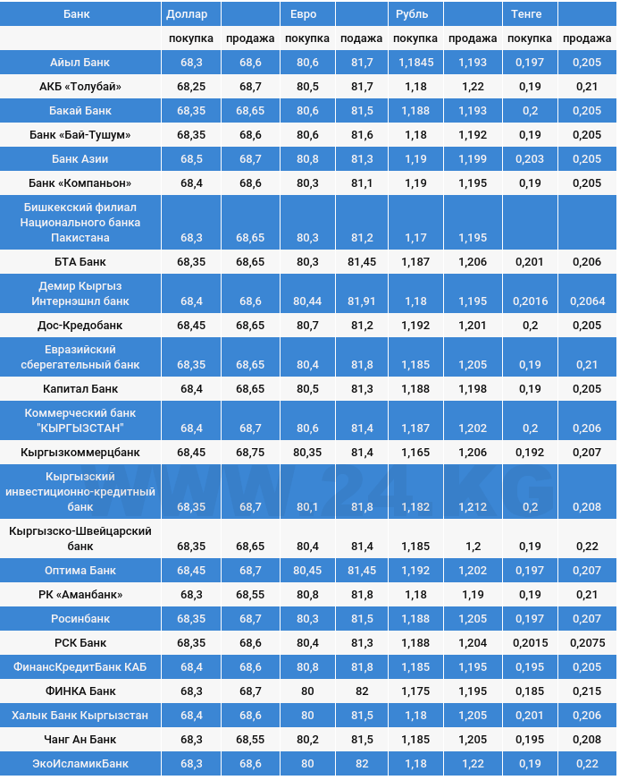Чет элдик валюталардын сомго карата коммерциядык банктардагы бүгүнкү наркы.