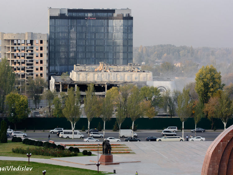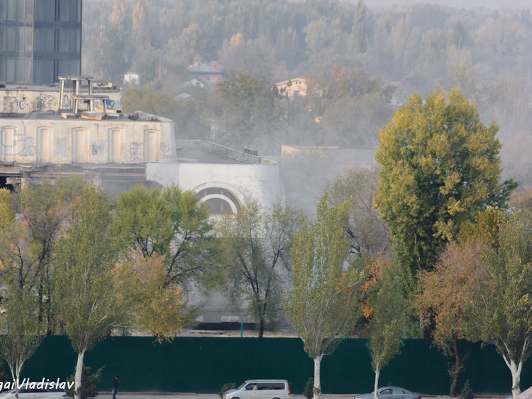 Бишкекте «Нарын» ресторанын бузуп башташты. Курулушчулар имараттын түштүк капталын бузууда.