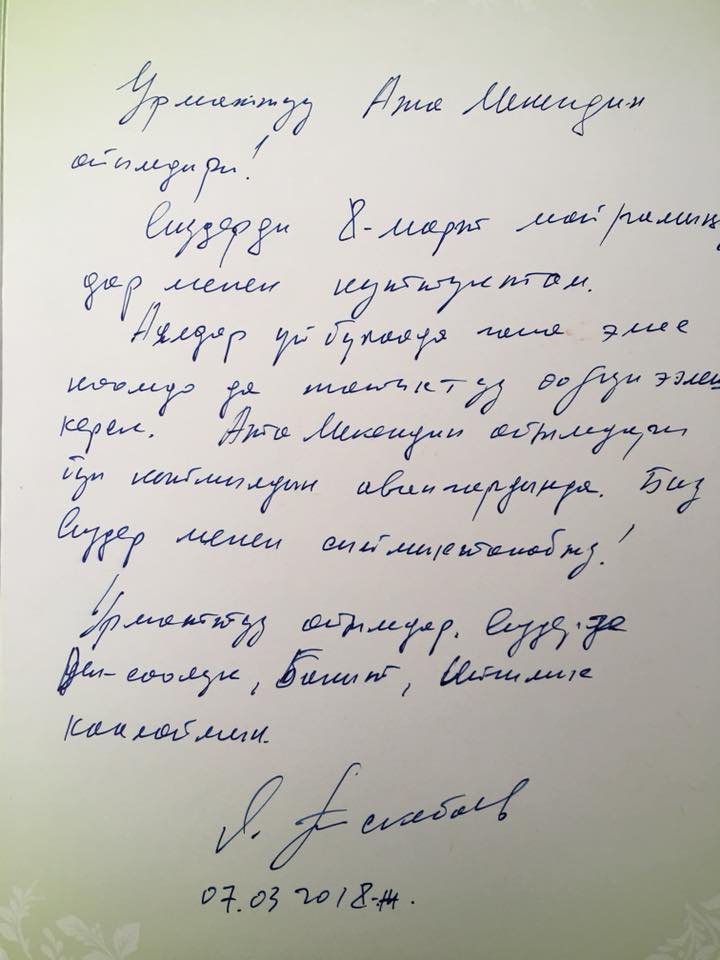 «Ата-Мекен» партиясынын лидери Өмүрбек Текебаев партиялаш айымдарга өзүнүн куттуктоосун жолдоду.