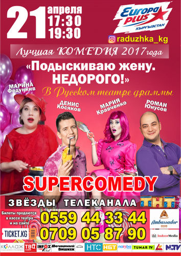 Бишкекте биринчи жолу SUPERCOMEDY заманбап орус жылдыздары келет. Алар «Өтө кымбат эмес аял издейм!» деген аталыштагы оюн коюшат.
