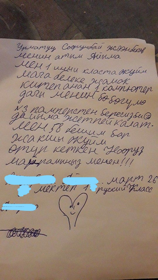 «Урматтуу Сооронбай Жээнбеков! Менин атым Айыма. Мен 1-класста окуйм. Мага жомок китеп, компьютер жана менин кичинекей бөбөгүмө 3-өлчөмдөгү памтепрс бериңизчи. Менин 58 бешим бар, жакшы окуйм. Нооруз майрамыңыз менен!» ,- деп жазган бөбөк катында.