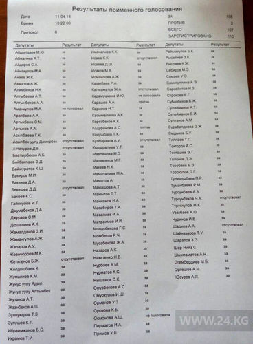 Баш мыйзамга ылайык, Жогорку Кеңештин депутаттарынын жарымынан көбүнүн макулдугу менен мамлекет башчы баш прокурорду кызматынан бошото алат. Тактап айтканда, Жолдубаеванын отставкасы үчүн 60тан ашык эл өкүлүнүн добушу керек. Ал эми парламенттин бүгүнкү жалпы жыйынында 105 депутат анын кызматтан кетүүсүн колдосо, эки гана депутат - Аалы Карашев менен Асел Кодуранова каршы добуш берген.Белгилей кетсек, Аалы Карашев менен Индира Жолдубаева тууган.