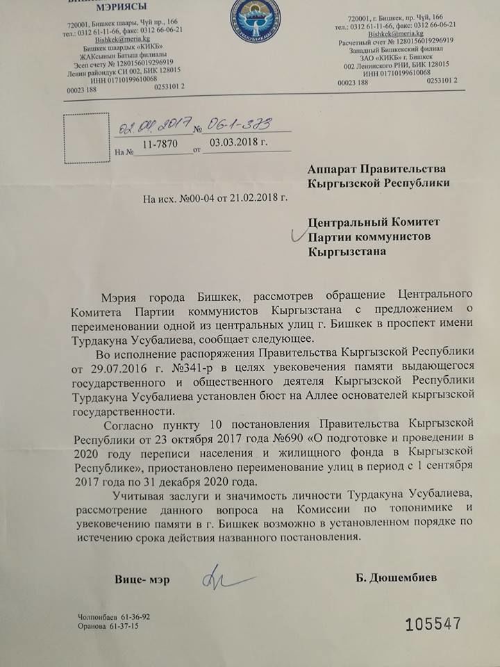 Калаа көчөлөрүнүн бирине Усубалиевдин ысымын ыйгаруу 2021-жылга чейин каралбайт. Кыргызстан коммунисттер партиясынын кайрылуусуна мэрия дал ушундай жооп кайтарды.