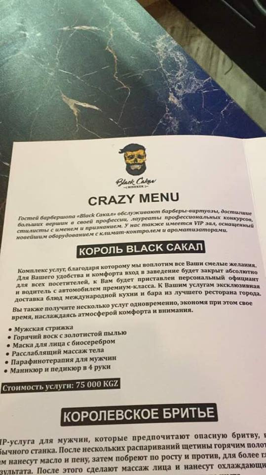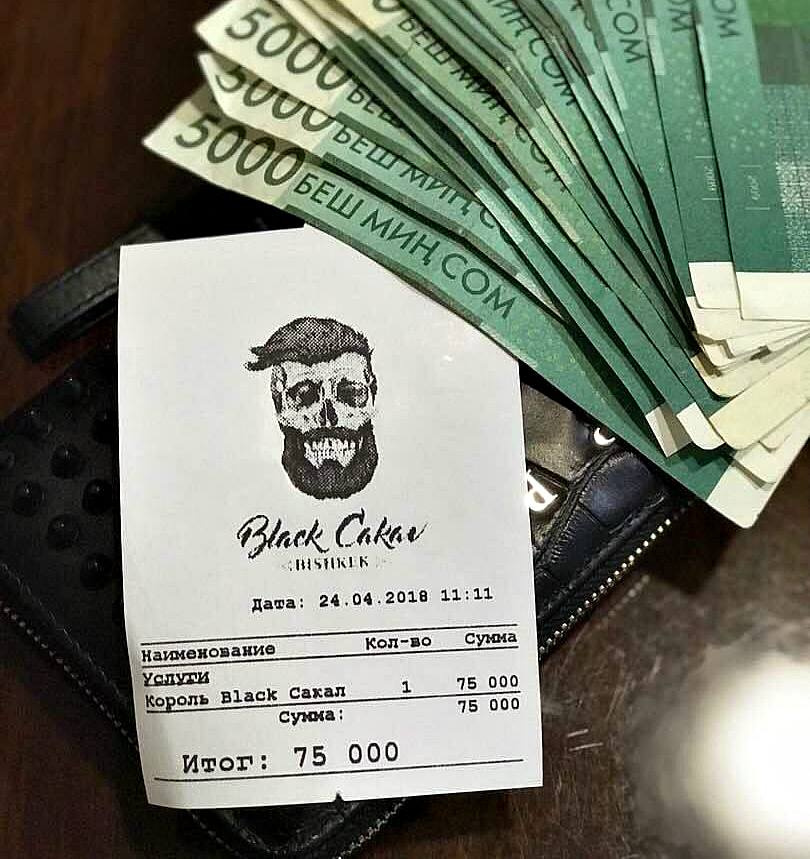 Чек социалдык түйүндөргө жайгаштырылган, анда кардар Бишкектеги барбершоптордун бириндеги баасы 75 миң сом турган «Король Black Сакал» кызматынан колдонгону маалым болгон.