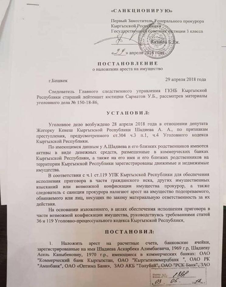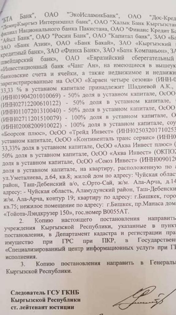 Камакка алынуучу мүлктөрдүн тизмесине Аскарбек Шадиев жана анын жакындарына тиешелүү Кыргызстандын банктарындагы эсеби, «Карвен клуб, «Боорсок плюс», «Трейд инвест», «Континенталь транс сервис», «Аква инвест», «Союз инвест» жана дагы бир катар ишканаларындагы үлүшү. «Тойото Ландкраузер 150» үлгүсүндөгү уунасы, «Ала-Арча» ВИП шаарчасындагы үйү жана Бишкек шаарындагы эки батири кирди.