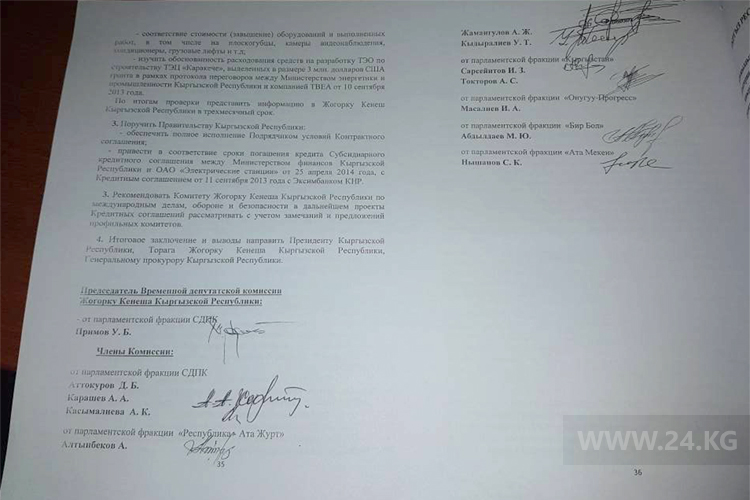 Ошондой эле 386 миллион доллар тууралуу насыялык макулдашуу англис тилинде түзүлүп, ага ошол кездеги каржы министри Ольга Лаврова кол койгон. Бирок өкмөт макулдашуунун долбоору менен орус тилинде таанышкан.Корутундуда ЖЭБ айрым курулуш иштери толук аяктай электе эле ишке берилгени жазылган. Депутаттар Башкы прокуратураны жана УКМКны 386 миллион доллардын максаттуу пайдаланылганы жана ТВЕАдин жалданууларынын аткаминерлер менен биргелешип иш алып баруусун текшерүүгө чакырды.