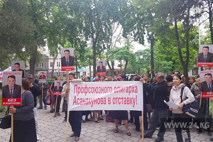 Бишкекте профсоюздар үйүнүн жетекчисинин ишине нааразы болгондор митингге чыгышты. Алар колдоруна «Асанакунов, кетсин!» деген жазуусу бар кагаздарды көтөрүп алган. Каршылык акциясына чыккандар мекеменин жетекчиси Мирбек Асанакуновдун иштен кетүүсүн талап кылышууда.