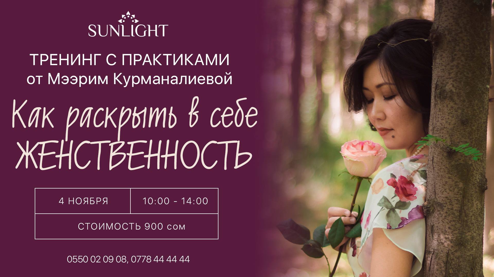 Вы узнаете, как устроена женщина, как полюбить себя и найти источник женской мудрости. Тренер — акушер-гинеколог, врач-генетик Мээрим Курманалиева. Регистрация по телефону 0550020908.