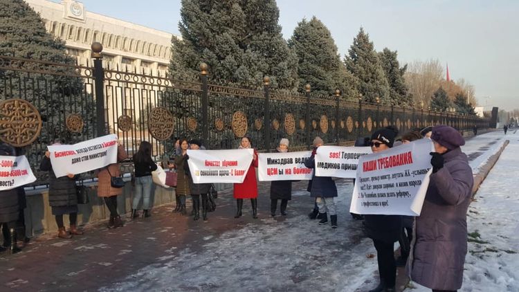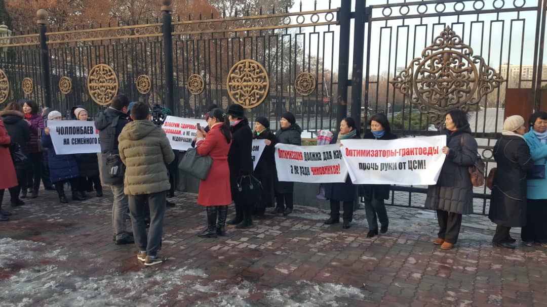 В Бишкеке врачи 19 центров семейной медицины вышли на митинг к «Белому дому». Около 50 медиков выступают против реформ Минздрава. В частности, оптимизации поликлиник и переквалификации узких специалистов.
