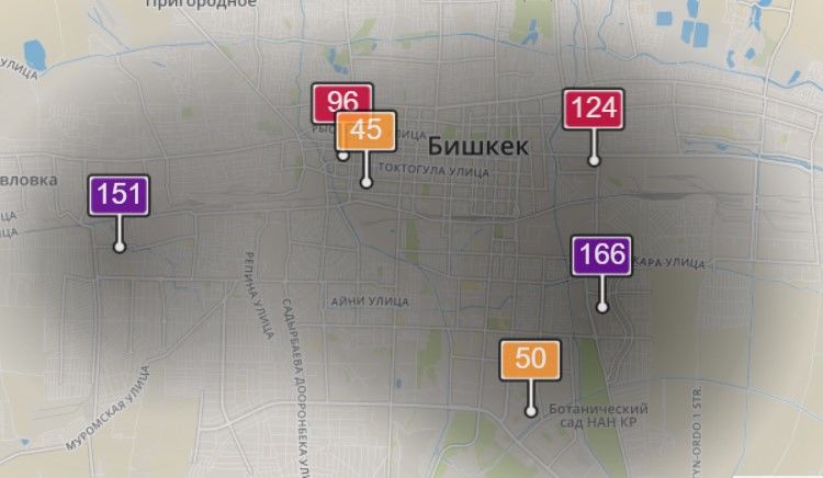 Общественное объединение MoveGreen и активист из Алматы Павел Александров собрали для Бишкека датчики и привязали их к карте.Для подсчета уровня загрязнения берут среднесуточные показатели. На карте также отмечен уровень загрязнения в режиме онлайн.