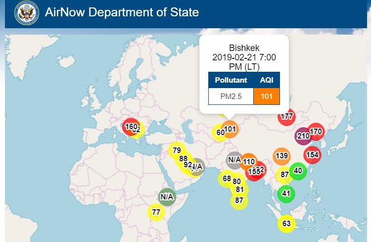 Посольство США в Кыргызстане также установило датчик, измеряющий уровень загрязнения воздуха. Информация обновляется ежечасно.