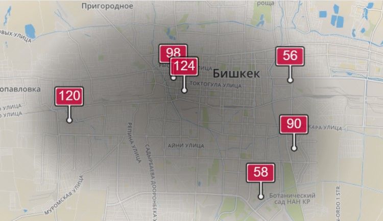 2. В районе улиц Бейшеналиевой/Токтогула. Уровень загрязнения превышен в 1,4 раза: PM2.5 среднесуточный — 49 мкг/м³, на момент измерения — 98 мкг/м³.